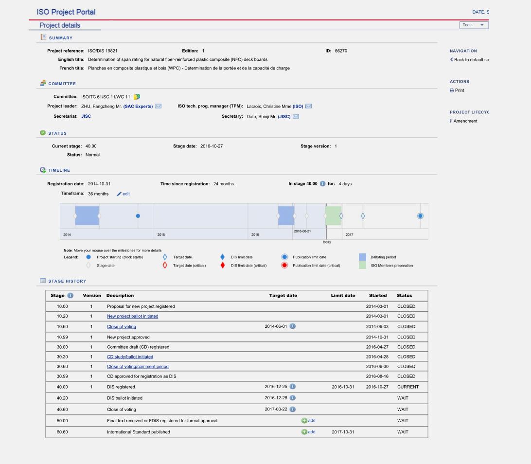 2017年3月,我公司牽頭制訂的國際標準ISO/DIS 19821《Determination of span rating for natural fiber-reinforced plastic composite (NFC) deck boards》通過ISO TC61/SC11 標委會投票。公司于5月份向ISO TC61/SC11 秘書處提交了FDIS稿件,預計標準將于2017年10月前正式發布。