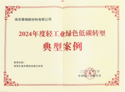 近日,南京聚鋒新材料有限公司(以下簡稱南京聚鋒)“難再生廢棄塑料資源化利用”項目,榮獲中國輕工業聯合會“2024年度輕工業綠色低碳轉型典型案例”的榮譽稱號。獲得此殊榮的還有小米、海信、雀巢和蒙牛等數十家國內著名企業。南京聚鋒做為一家民營中小型企業,同時,也是“中國塑料加工工業協會”中唯一一家獲此殊榮的企業,我們深感榮幸和光榮。