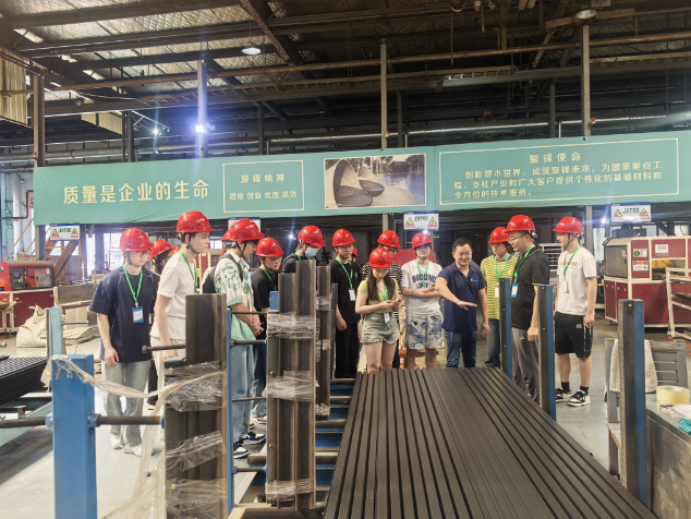 交流活動伊始,在公司會議室舉行了座談交流會,簡要介紹了企業的發展歷程、核心技術以及主要產品。隨后,在負責人的引導下,南林師生們參觀了公司的產品展廳和生產車間。師生們走進生產車間,實地觀摩了從原材料擠出成型到后期處理的全流程的生產線。師生們對公司產品表現出了濃厚的興趣,紛紛駐足觀察,同時大家也對新型環保材料從研發到規模化生產的轉化過程有了直觀、深入的認識。